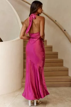 Selfie Leslie India Cowl Halterneck Satin Maxi Dress Fuchsia