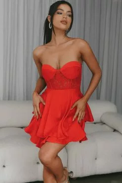 Selfie Leslie In Your Arms Strapless Lace Bodice Layered Hem Mini Dress Red