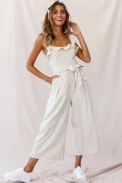 Selfie Leslie Kaia Ruffle Strap Wide-Leg Capri Jumpsuit Beige