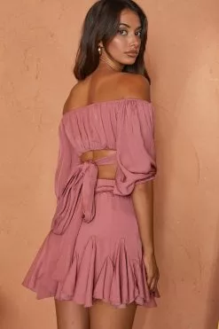 Selfie Leslie Linka Off-Shoulder Half Sleeve Tie-Back Crop Top Rose