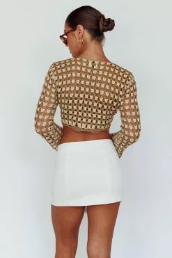 Selfie Leslie Maycie Long Sleeve Crochet Crop Top Taupe Multi