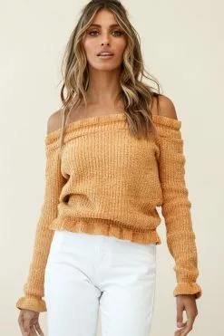 Selfie Leslie Mackenzie Off-Shoulder Long Sleeve Knit Top Mustard