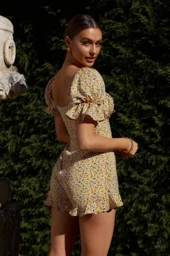 Keep Dreaming Puff Sleeve Frill Romper Floral Yellow