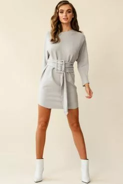 Selfie Leslie Lorelei Long Sleeve Wide Belt Knit Dress Grey