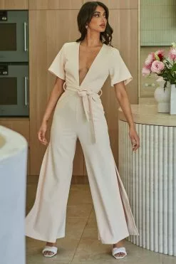 Selfie Leslie Rhone River Deep V-Neckline Wide Leg Waist Tie Jumpsuit Sand