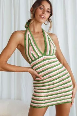 Mojave Sunset Halterneck Knit Mini Dress Striped Green