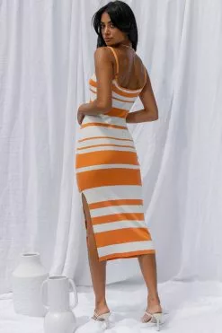 Selfie Leslie Dayana Cut-Out Waist Side Split Knit Midi Dress Striped Orange
