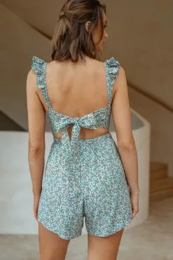 Lazy Sunday Frill Strap Tie-Up Back Romper Floral Print Blue
