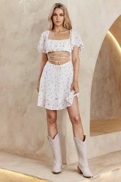 Mika&Gala Full Hearts Lace-Up Waist Dress Floral White