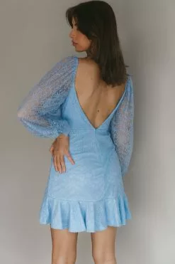 Selfie Leslie Halley Balloon Sleeve Frill Bust Flounce Hem Lace Dress Baby Blue