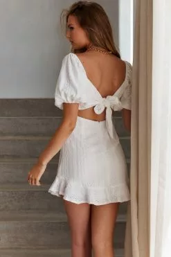 Selfie Leslie Mikayla Puff Sleeve Tied Back Eyelet Embroidery Dress White