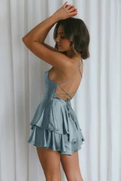 Selfie Leslie Mon Cherie Cowl Neckline Lace-Up Back Romper Steel Blue