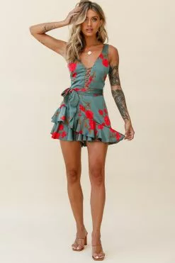 Selfie Leslie Wishful Thinking Plunging Neckline Ruffle Hem Romper Floral Print Sage