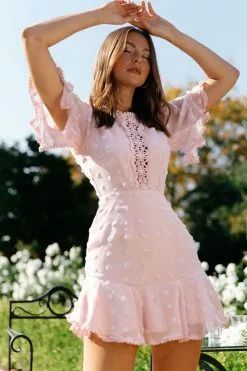 You will look super sweet in our Afternoon Delight dress. We love its textured fabric throughout and that gorgeous crochet lace accent in the bodice. Perfect for a wedding or special occasion teamed with nude heels and a chic mini purse.