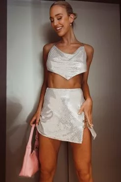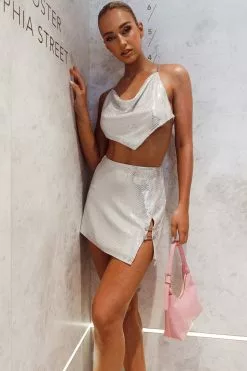 Jaws will drop when you strut by in our super hot Aleigh crop top. We are obsessed with its open back and chain straps. Perfect for a glam girls’ night out at your fave rooftop bar. Team it with platform heels and its matching mini skirt for a look that will turn heads.