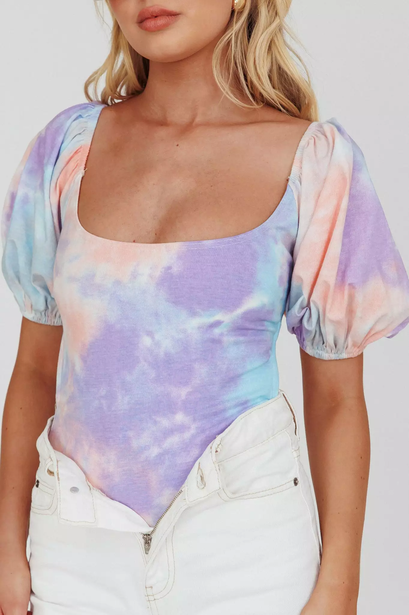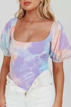 - Purple/blue tie-dye bodysuit