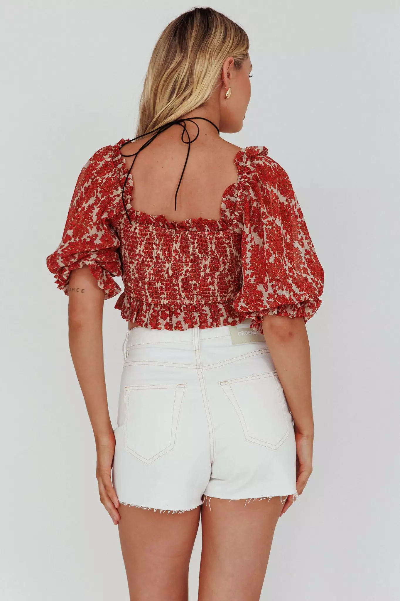 Here Comes The Sun Meet Cute Shirred Bust Off-Shoulder Crop Top Floral Beige