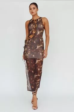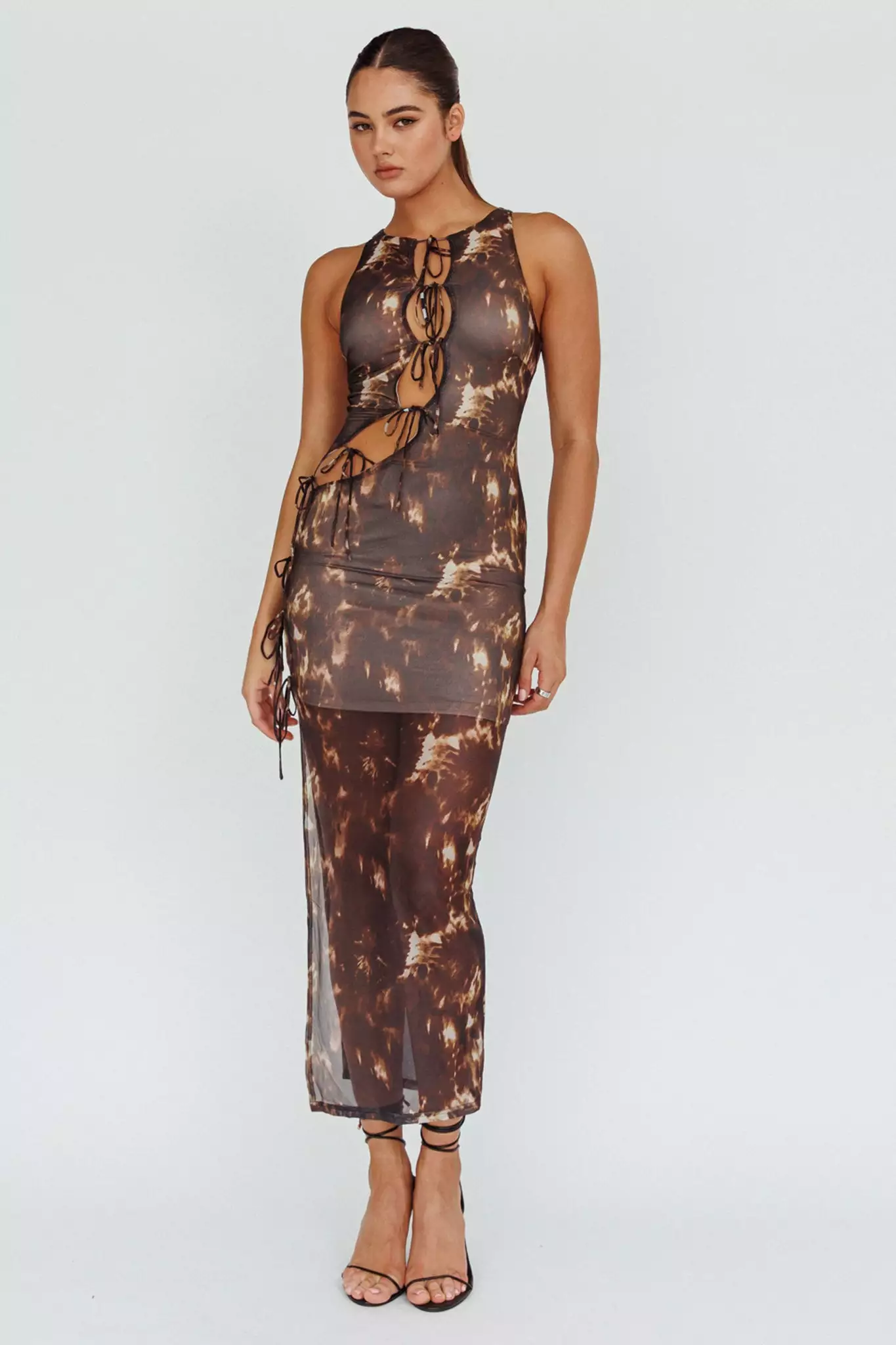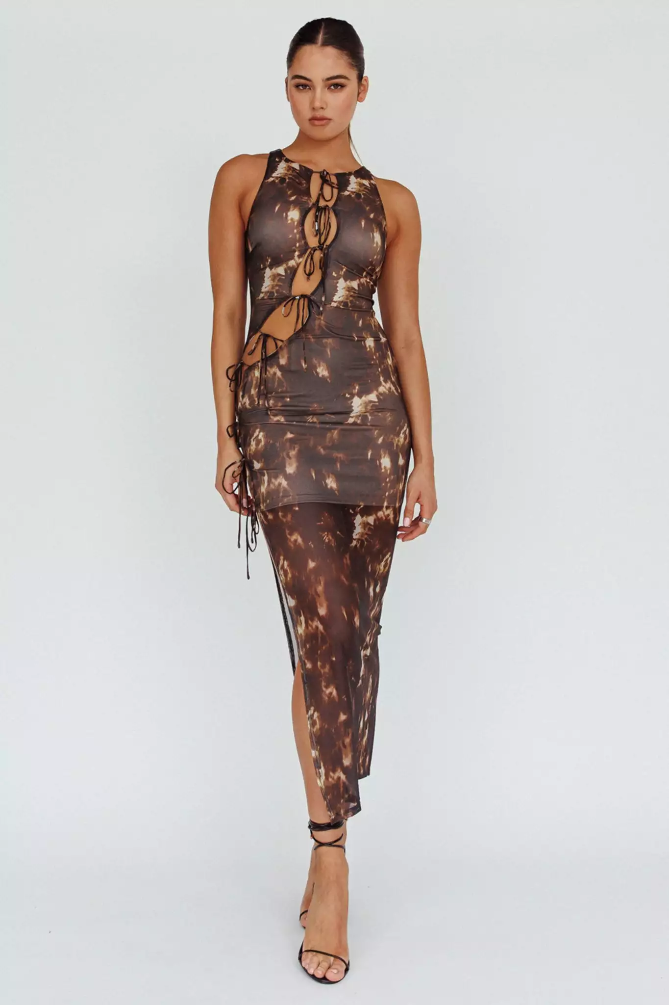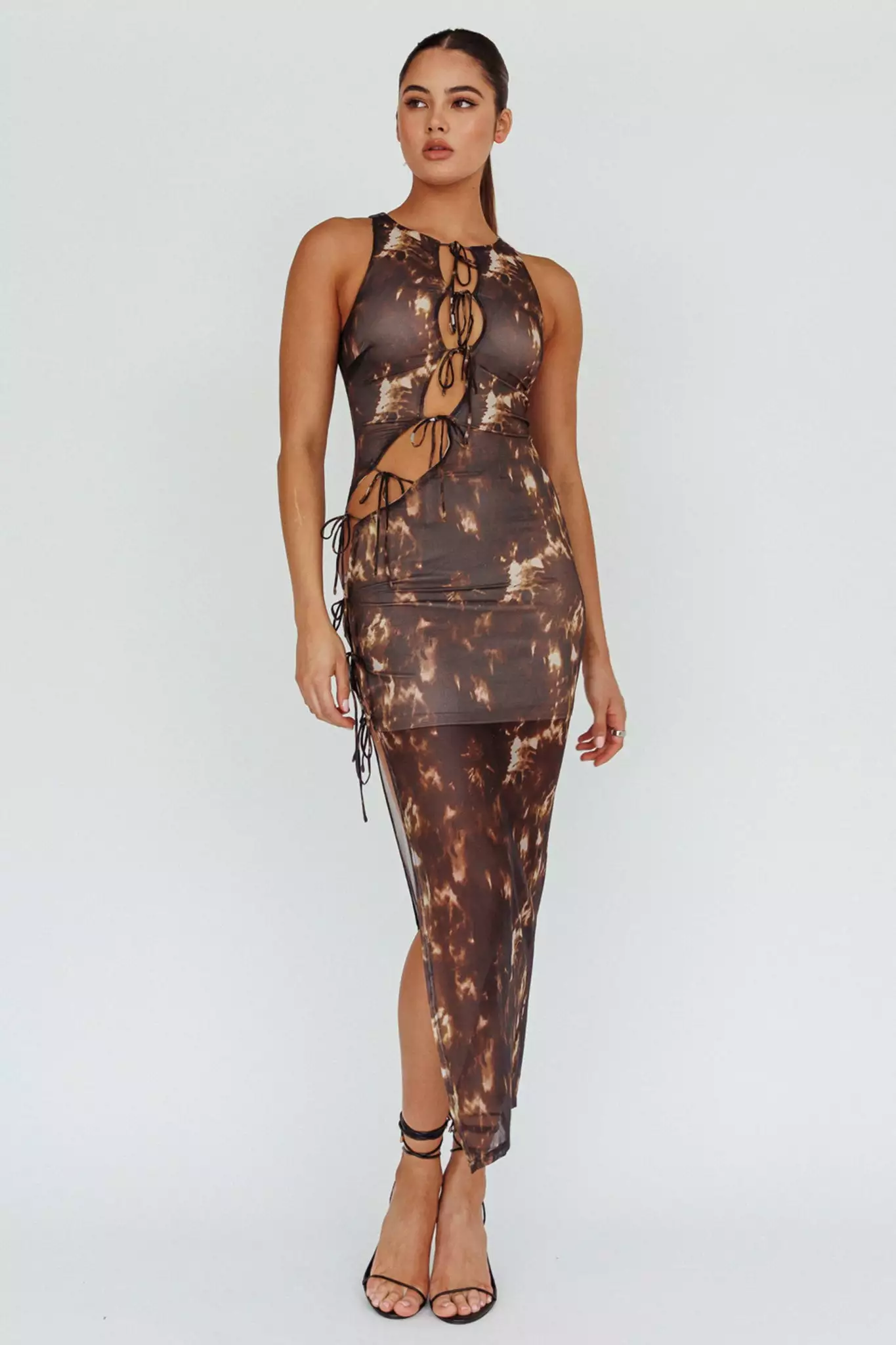 Get ready to steal the show in our super hot Mira maxi dress. Featuring a sexy, keyhole feature with ties from the neckline to thigh. This one is sure to get a lot of attention! Team it with tan mules and a tote for a look that will turn heads.