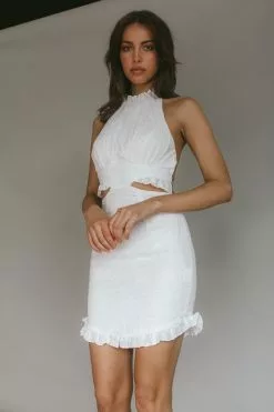 Make jaws drop when you walk in wearing our stunning Giovana mini dress. Featuring a halterneck style, frill trim and an open back with tie closures, we’re in love! Wear it to graduation or a birthday celebration teamed with heels and a clutch.