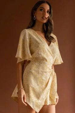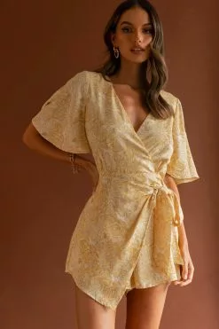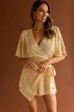 Turn heads in our pretty Nadi romper. Perfect as the weather starts to heat up. Featuring a flattering wrap style, tying at the side, it looks like shorts in the back but gives the illusion of a skirt from the front. Team it with nude heels and statement earrings for a girls’ night out!