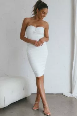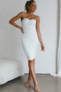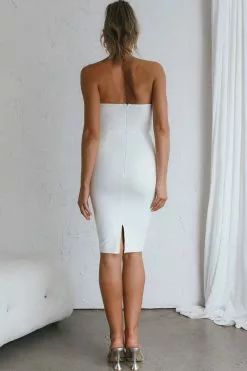 Turn heads in our super hot Pernille knee length dress. Featuring a strapless style and ruching in the bodice. It’s perfect for a fun girls’ night out! Pair it with white, tie-up heels and a small purse for an unforgettable look.
