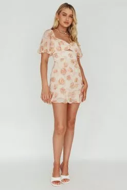 - Leaf print, beige mini dress