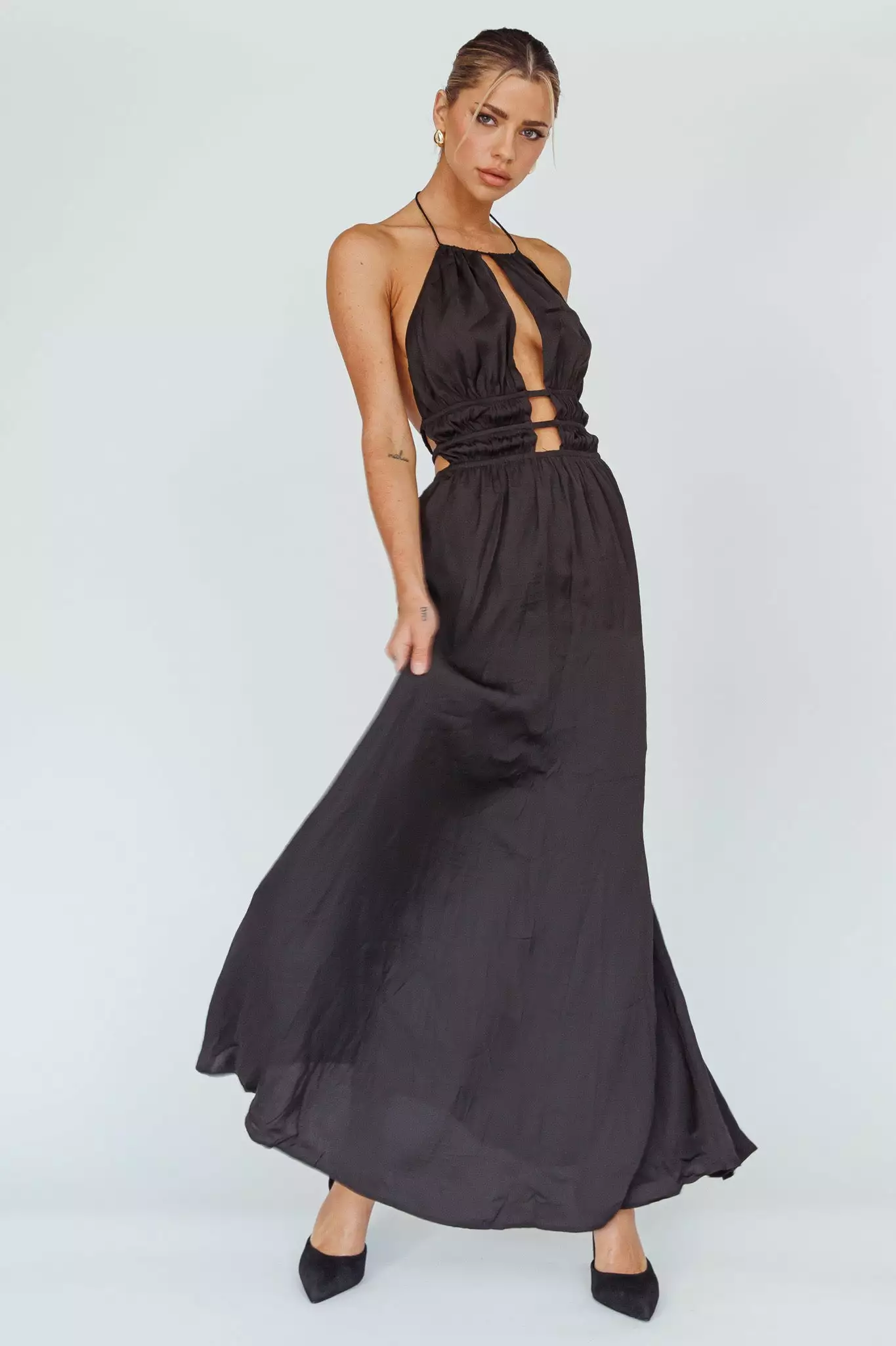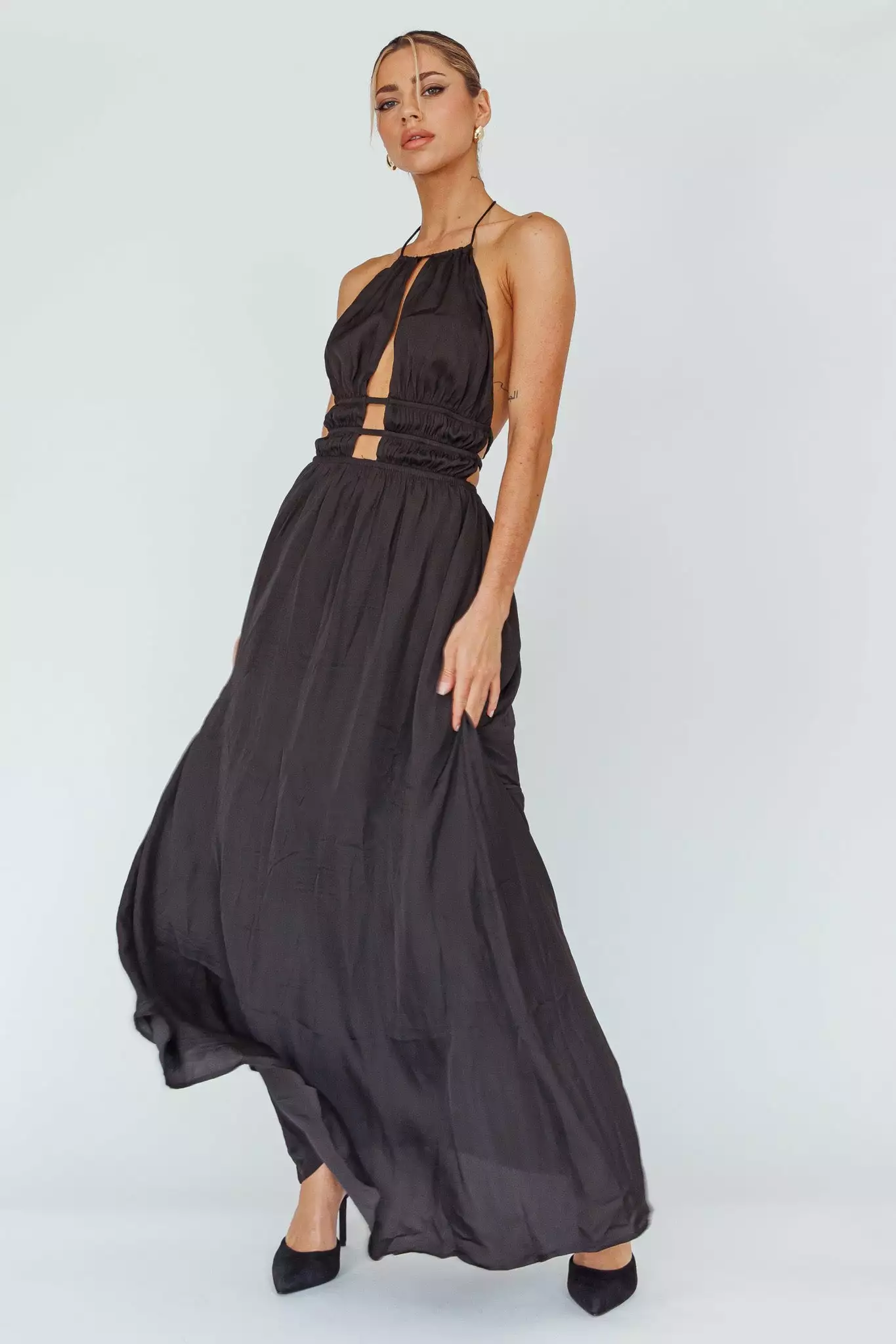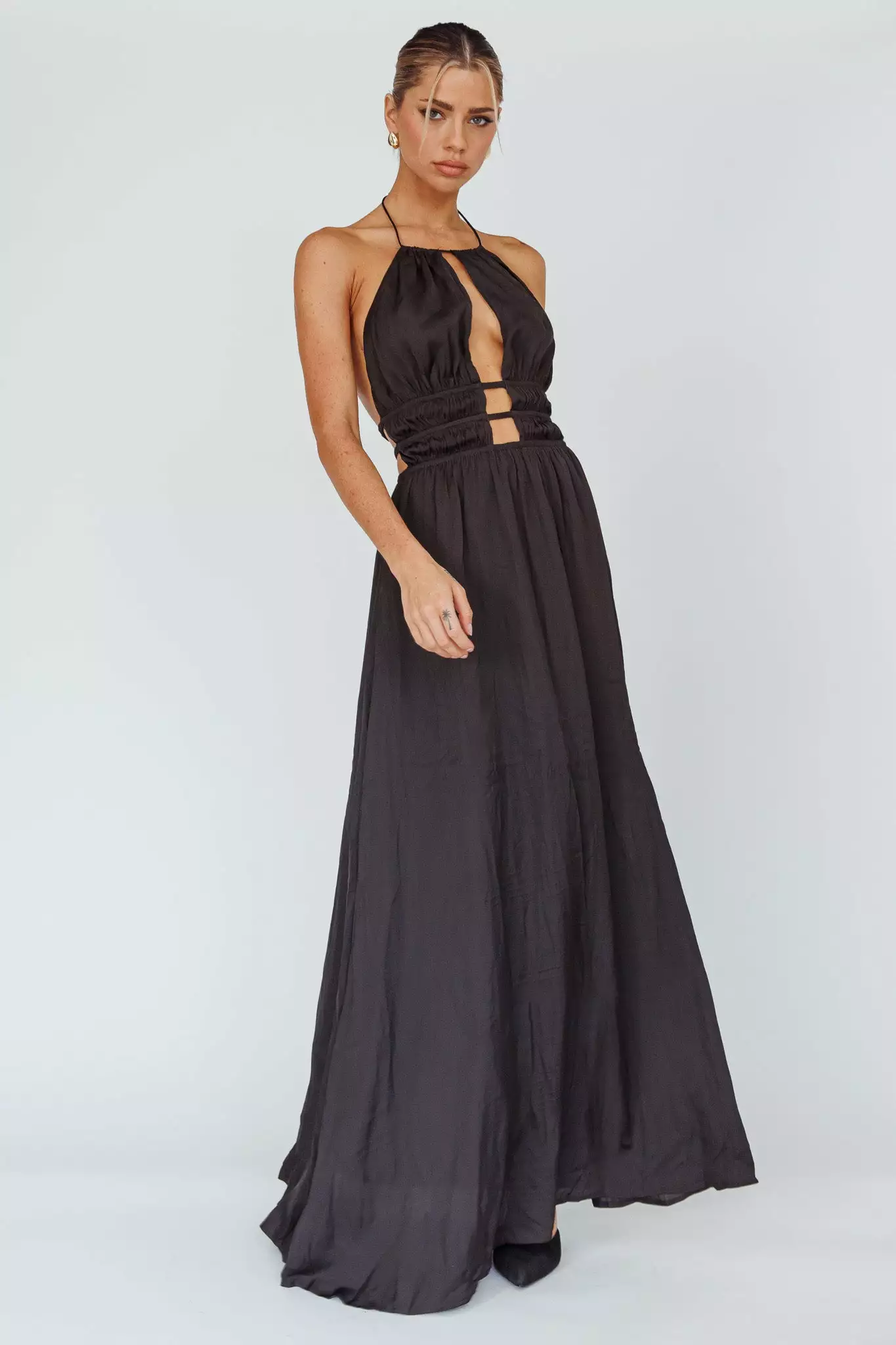 Steal the spotlight in our gorgeous Cyndi maxi dress. Featuring a cut-out bodice and open back with gold buckle detail. It’s perfect for a birthday or special occasion. Team it with mules and a tote for a chic look we are all about.