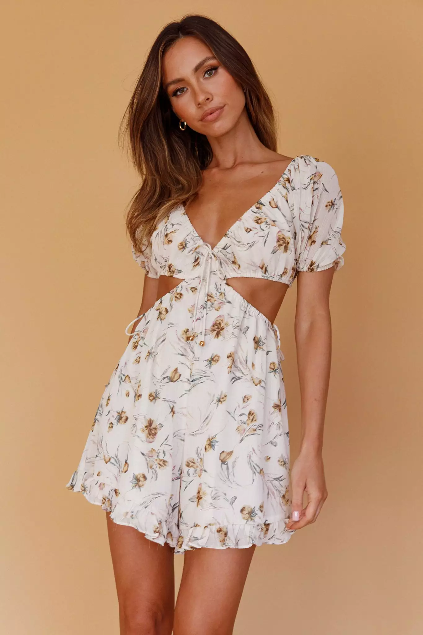 Call off the search, we’ve found the perfect weekend romper! Our Fancy Free romper is perfect for dreamy day dates with your crush or Sunday brunch with your besties. With its frill trim detail and cut-out waist, you won’t be able to stop the stares. Team it with tan mules and a mini purse for a super hot look.