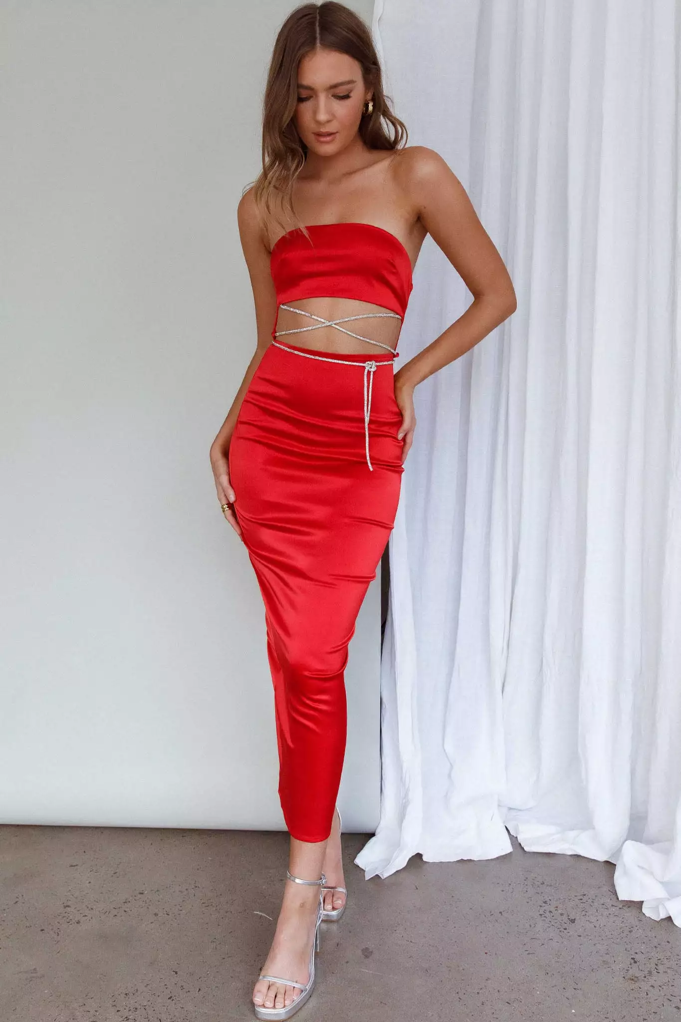 Make an entrance in our hot Nohemi maxi dress. Featuring a cut-out waist with diamante strap detail that ties in the back, we’re obsessed! Perfect for a girls’ night out or birthday celebration teamed with a clutch and diamante mules!