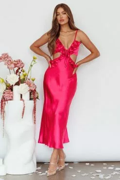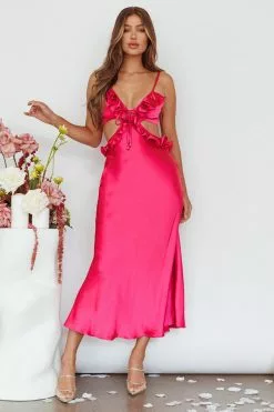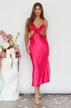 This dress needs a moment, please! We are head over heels for our Stole My Heart maxi dress. Featuring the sweetest, frill trim detail and a cut-out waist. It’s perfect for a special birthday celebration! Team it with perspex heels and a clutch and get ready for jaws to drop.