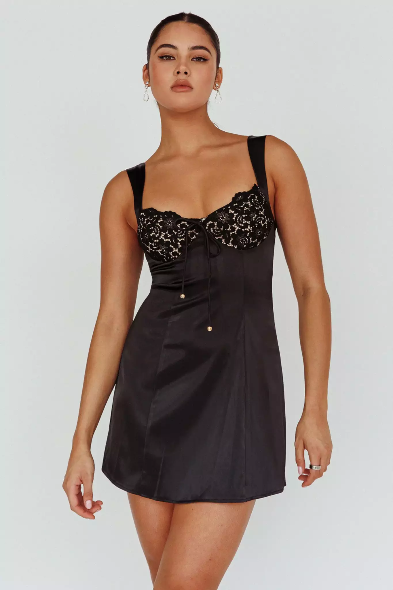 You will turn heads in our gorgeous Ti Amo mini dress. We are in love with the romantic lace detail in the bust. Perfect for a flirty date night with your lover. Team it with perspex heels and a clutch for an unforgettable look we are loving.