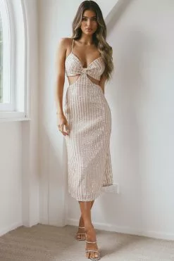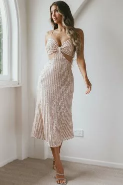 Jaws will drop when you strut by in our super hot Acapulco midi dress. Featuring a stunning, striped sequin fabric and cut-out waist. We are obsessed! Perfect for a glitzy birthday celebration or special event! Team it with a chic mini purse and strappy, tie-up heels for an unforgettable look!