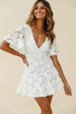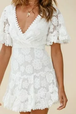 You’ll feel like a princess in our stunning Alaia dress. Partially lined, it features a gorgeous crochet lace throughout, surplice neckline, short, fluted sleeves and embroidery trim details. Perfect for a bridal shower or special event teamed with nude heels and a clutch.