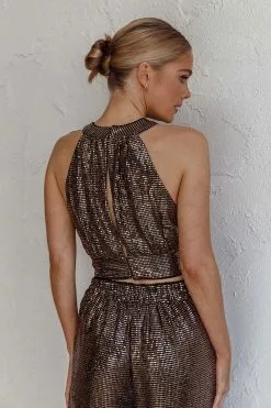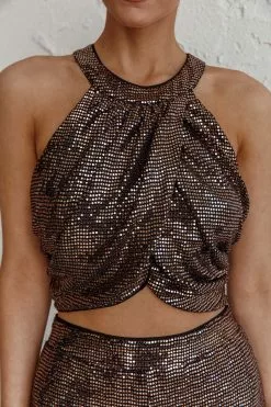 Selfie Leslie Anything Goes Draped Sequin Crop Top Gold