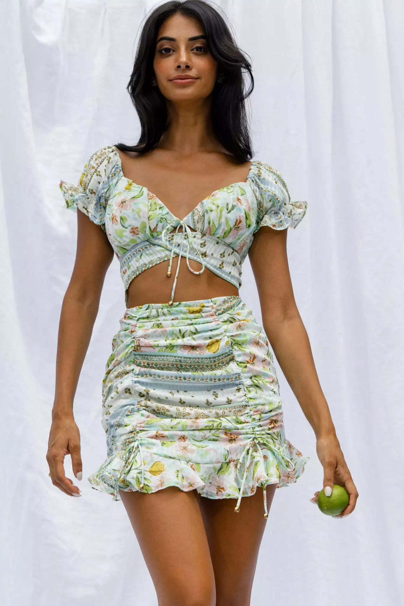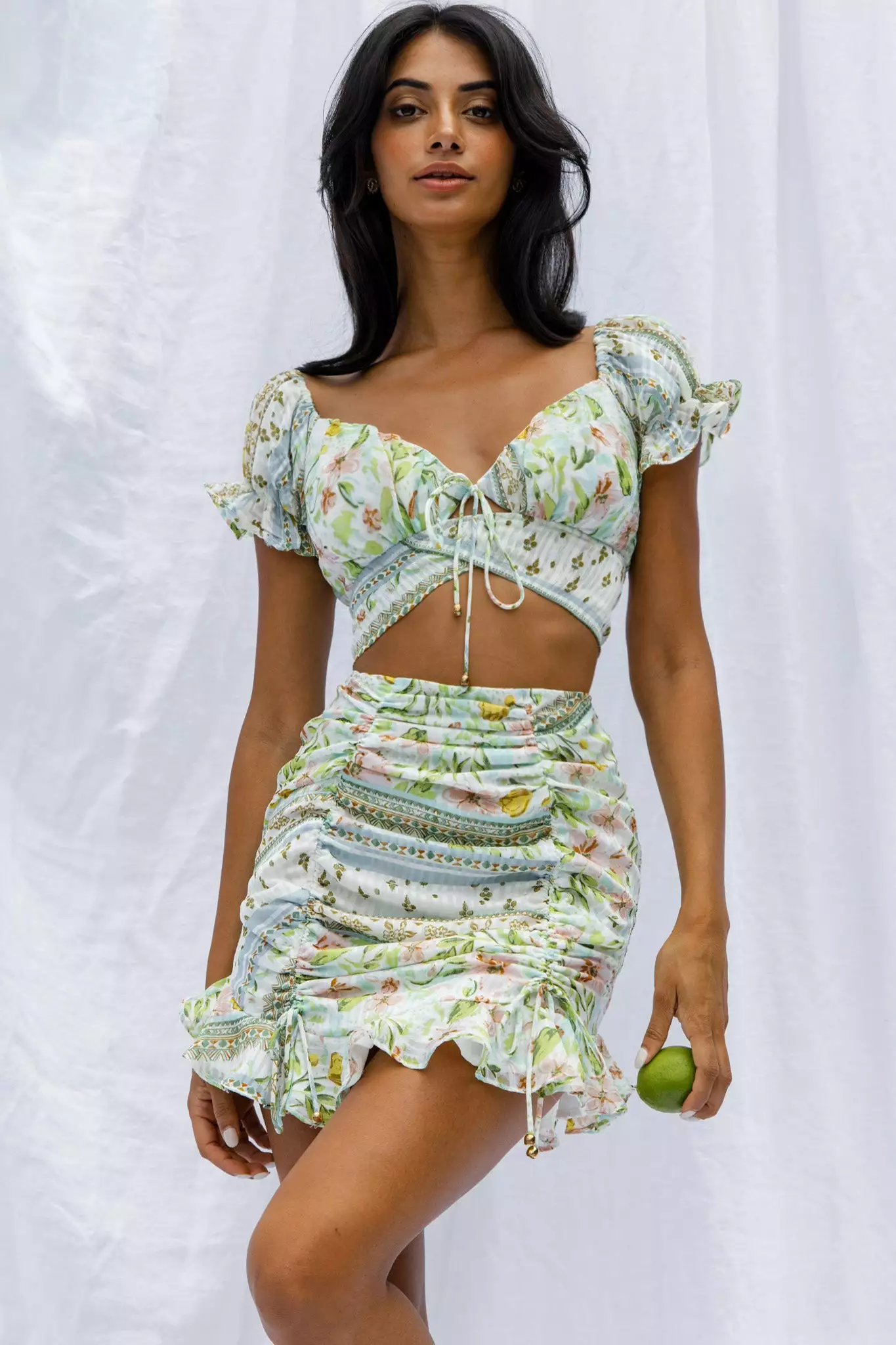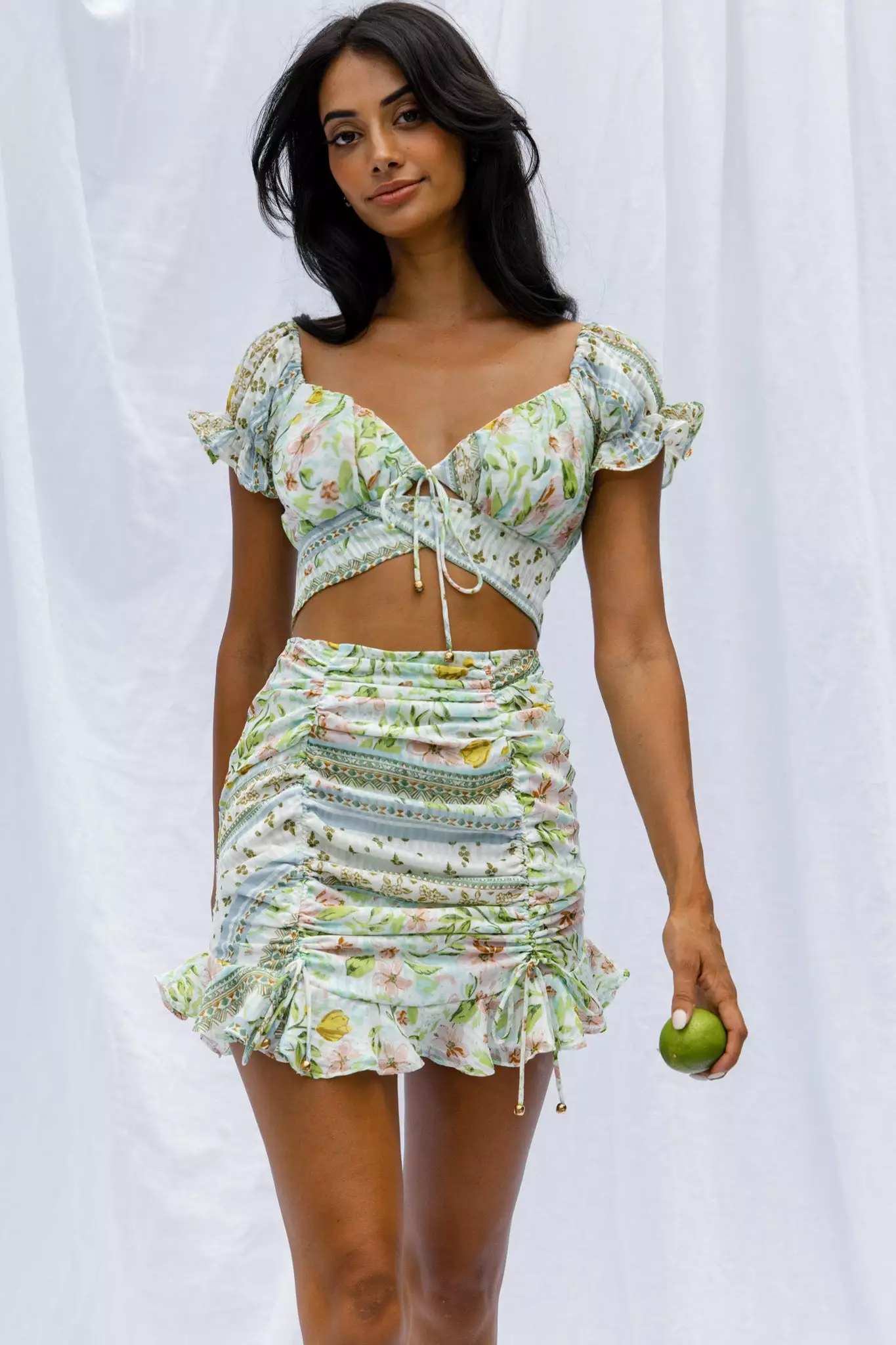 Our Azure Sky skirt is a major showstopper. Featuring drawstring ruching detail and a frill hem. It’s perfect for a sunny Spring day, brunching with your besties. Team it with its matching crop top for an It Girl look that’ll send you straight to the best-dressed list.