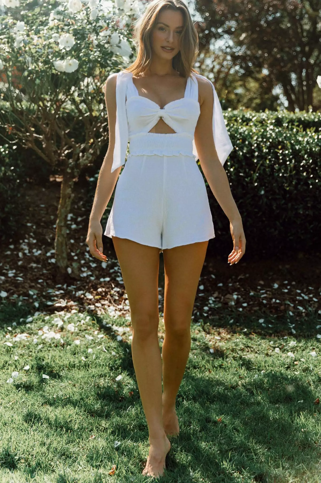 Selfie Leslie Break Of Dawn Bow Shoulder Shirred Waist Romper White
