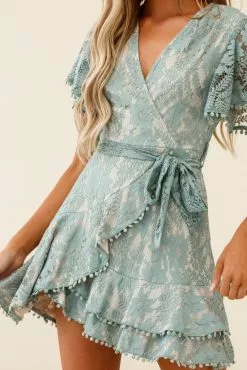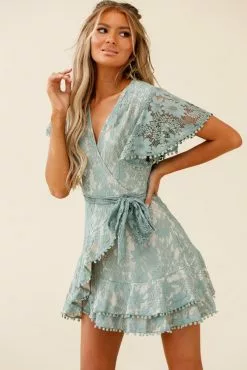Hey pretty lady, you’re causing quite a stir in our sweet, lace Cami dress! Featuring a faux wrap skirt, separate lace belt, on-trend ruffle hemline, pretty embroidered trim detailing, fluttery angel sleeves, partial nude lining and invisible zipper closure. Team it with delicate gold jewelry and nude heels for a look we are loving.