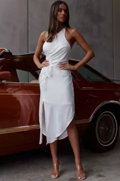 Steel the show in our stunning Casa Del Mar midi dress. Featuring a one-shoulder style and drawstring ruching detail in the waist, we’re in love! Perfect for sunset cocktails with your girls or a flirty date night. Team it with tan mules and a clutch for an unforgettable look.