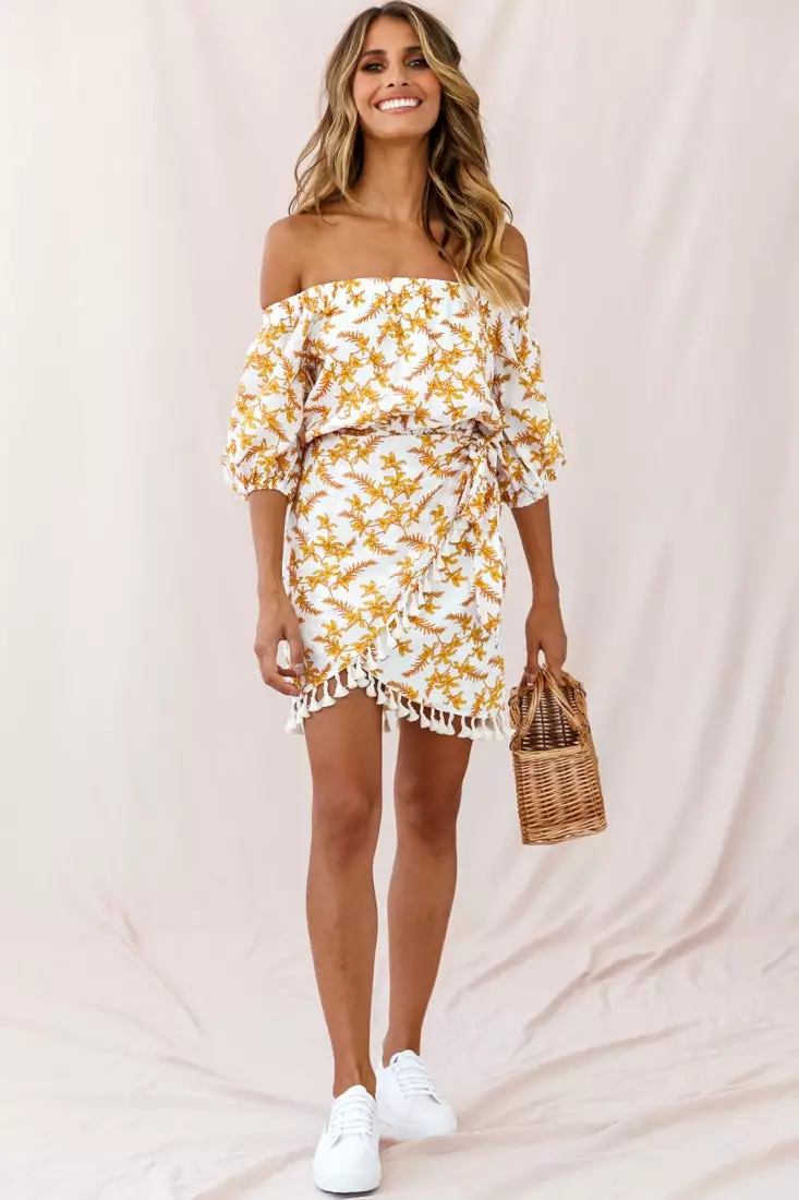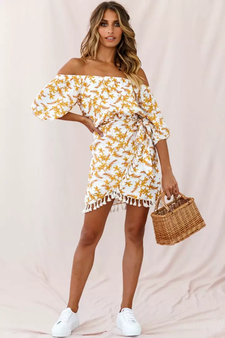 You’ll feel like escaping to a tropical island paradise in our super cute Cayman dress. Featuring an on-trend Bardot neckline with balloon sleeves, elasticated waist with a wrap style skirt that ties at the side, keyhole back with button closure and gorgeous cotton tassel-trimmed hemline. Perfect for warm nights sipping piña coladas at your favorite beach bar or Sunday brunch with your besties. Team it with espadrille wedges, gold hoop earrings and a straw tote for a look we are loving!