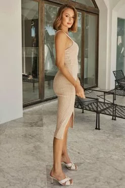 Turn heads in our gorgeous Chambery dress. Featuring a ribbed knit throughout and sexy front split. Perfect for date night or weekend brunch with your besties. Team it with mules and a small tote for a look we are loving.