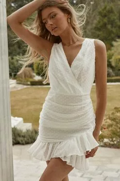 Selfie Leslie Cherish The Moment Ruched Ruffle Hail Spot Dress White