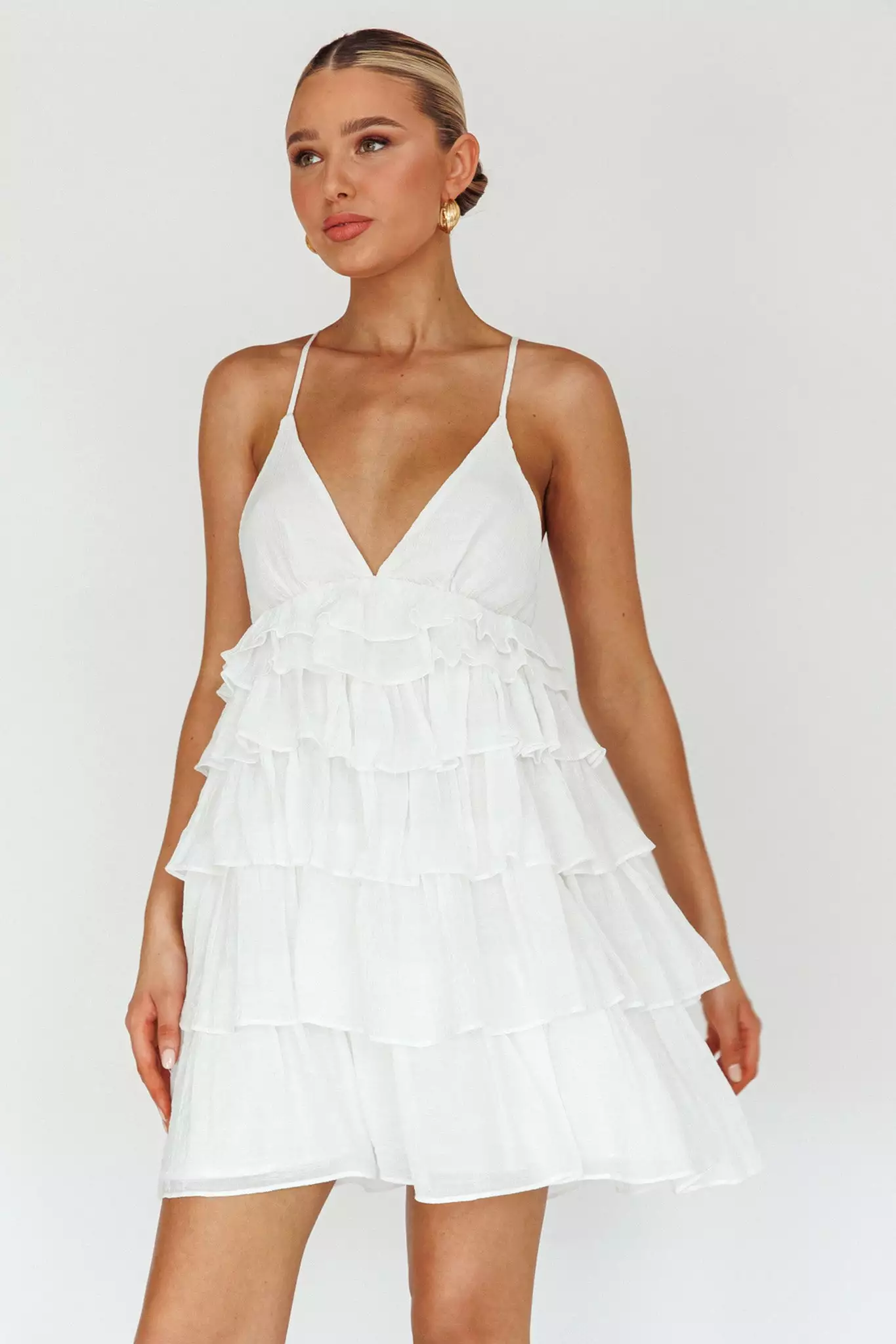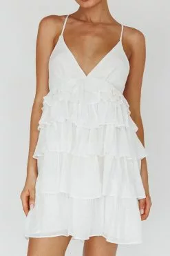 Steal the show in our super cute Dellia mini dress. We are in love with its feminine, tiered ruffles throughout. Perfect for a flirty date night with your love. Team it with mules and a purse for a chic look we are all about.