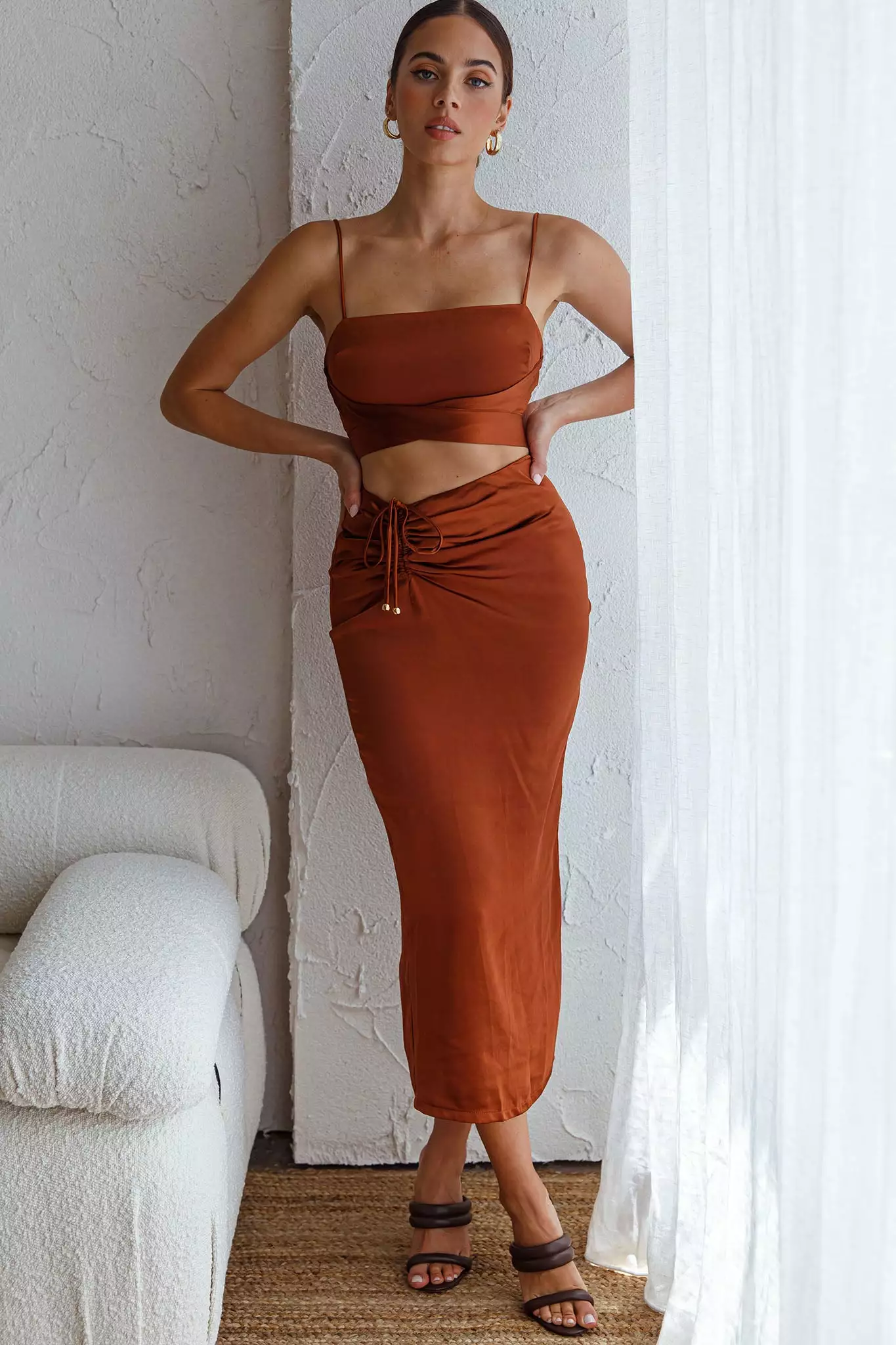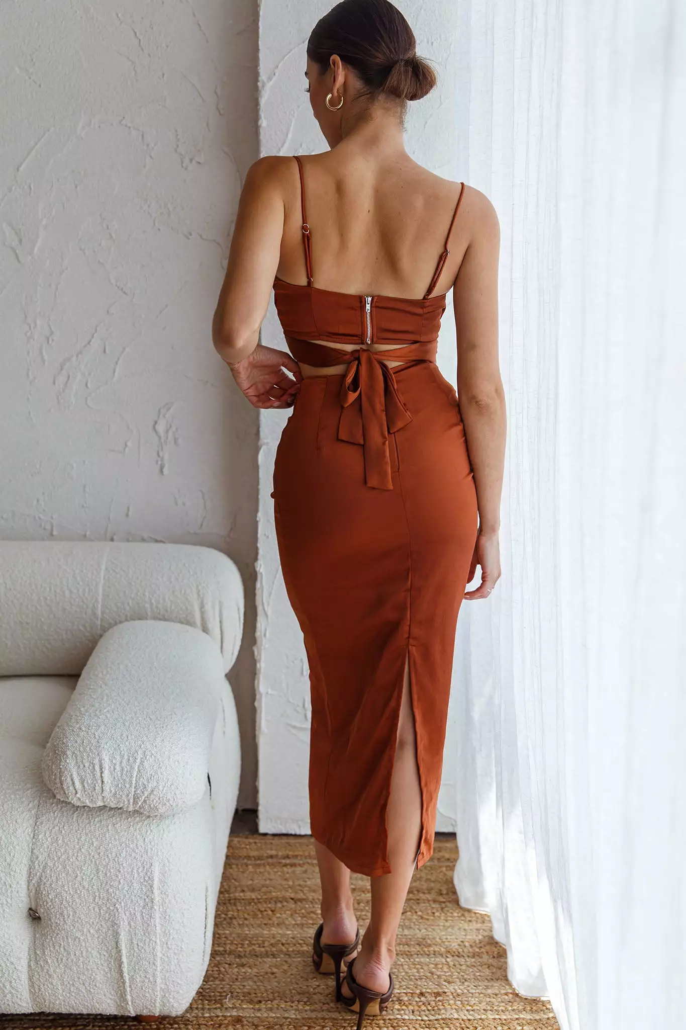 Jaws will drop when you walk by in our Desert Nights crop top. We are majorly crushing on that silky fabric and tie-up back. Perfect for romantic date nights teamed with its matching midi skirt and perspex mules.