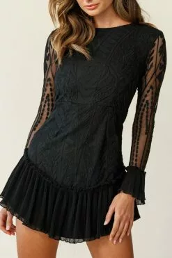 Stop whatever you are doing and take a moment to behold the beauty that is our bestselling Dreamy dress, now in a long sleeve style! Partially lined, it features long sleeves with ruffle cuffs, gorgeous embroidered-mesh overlay, and a flirty ruffle hemline. This dress has it all! Pair it with simple nude heels because this dress is already perfection.