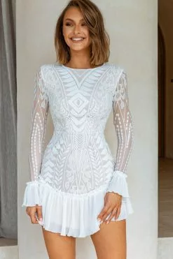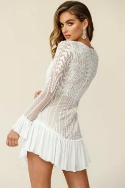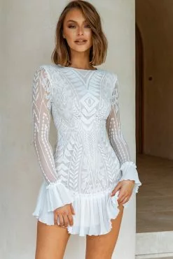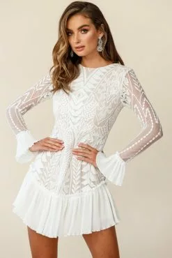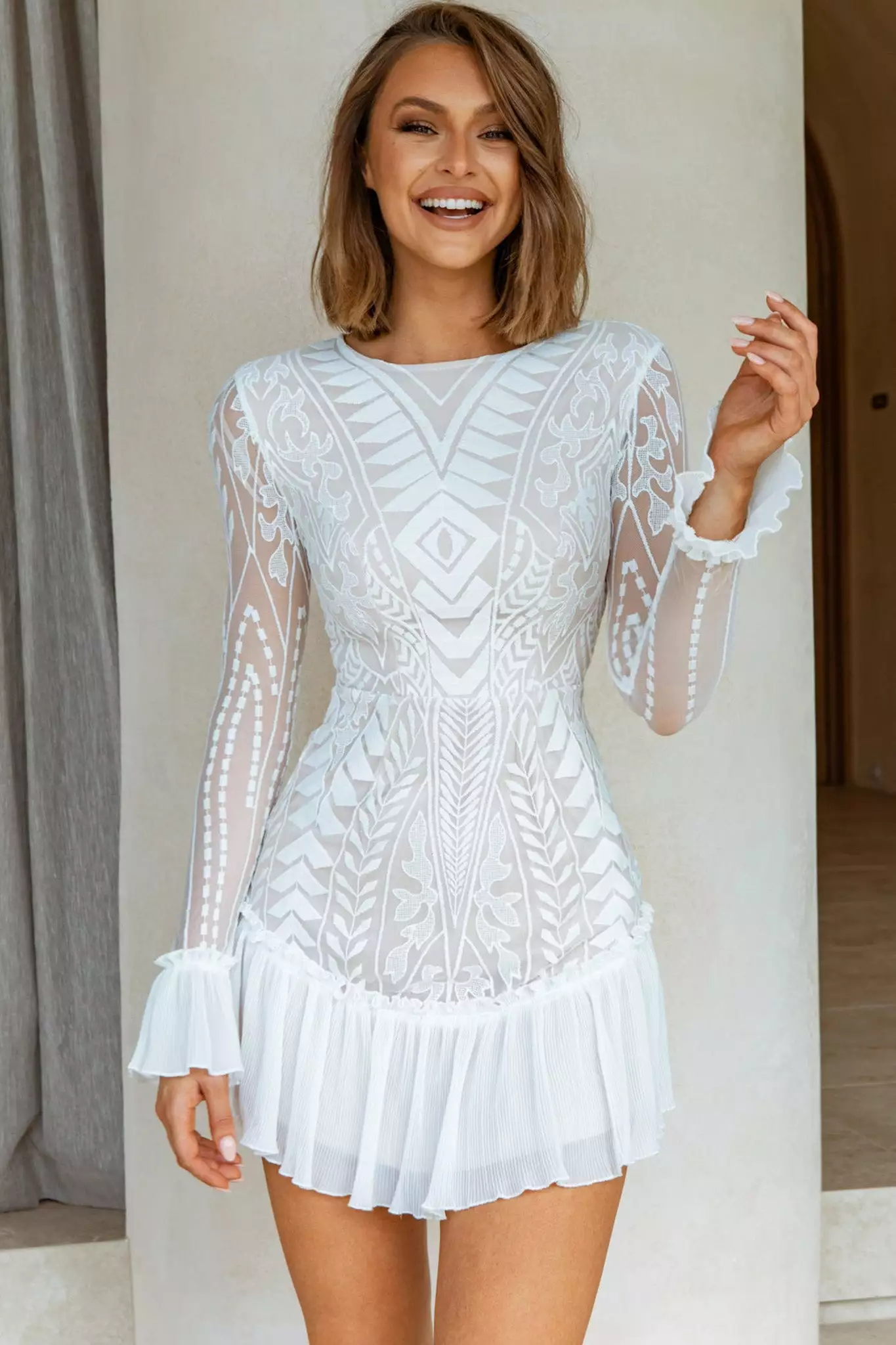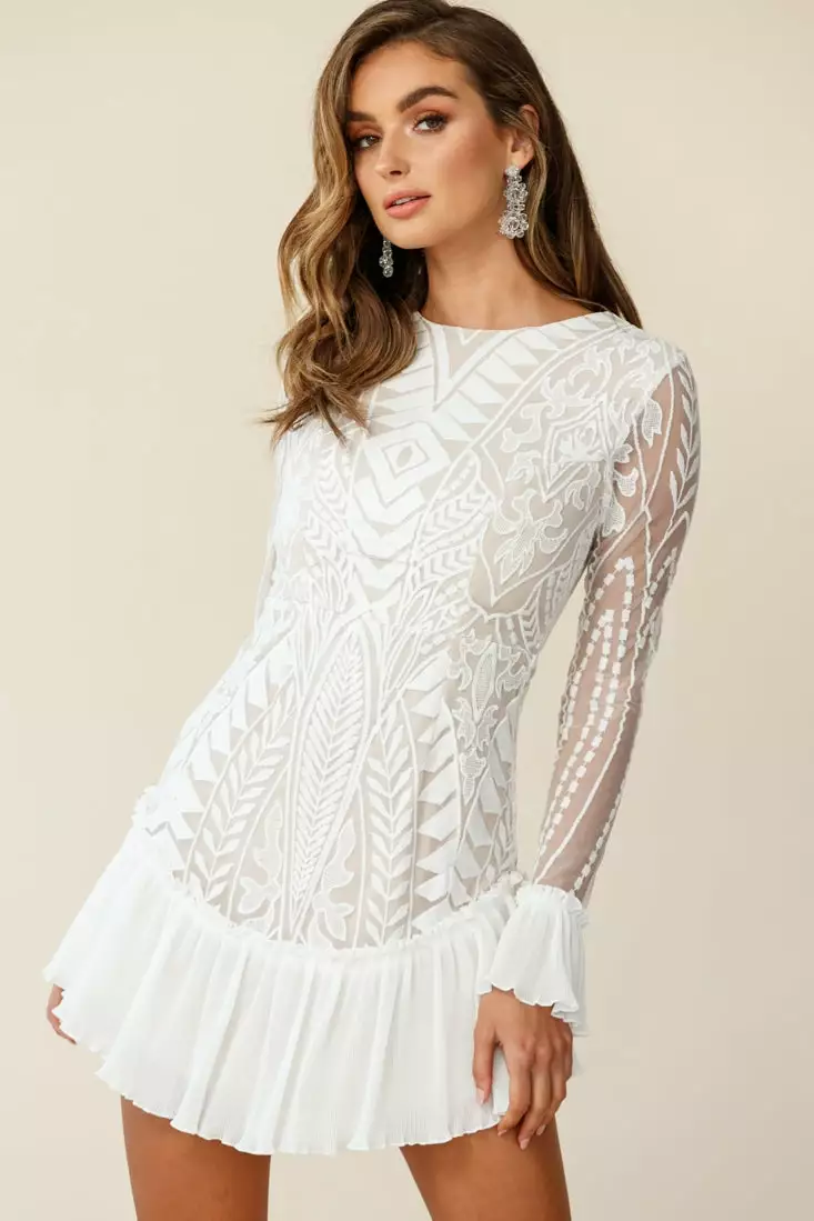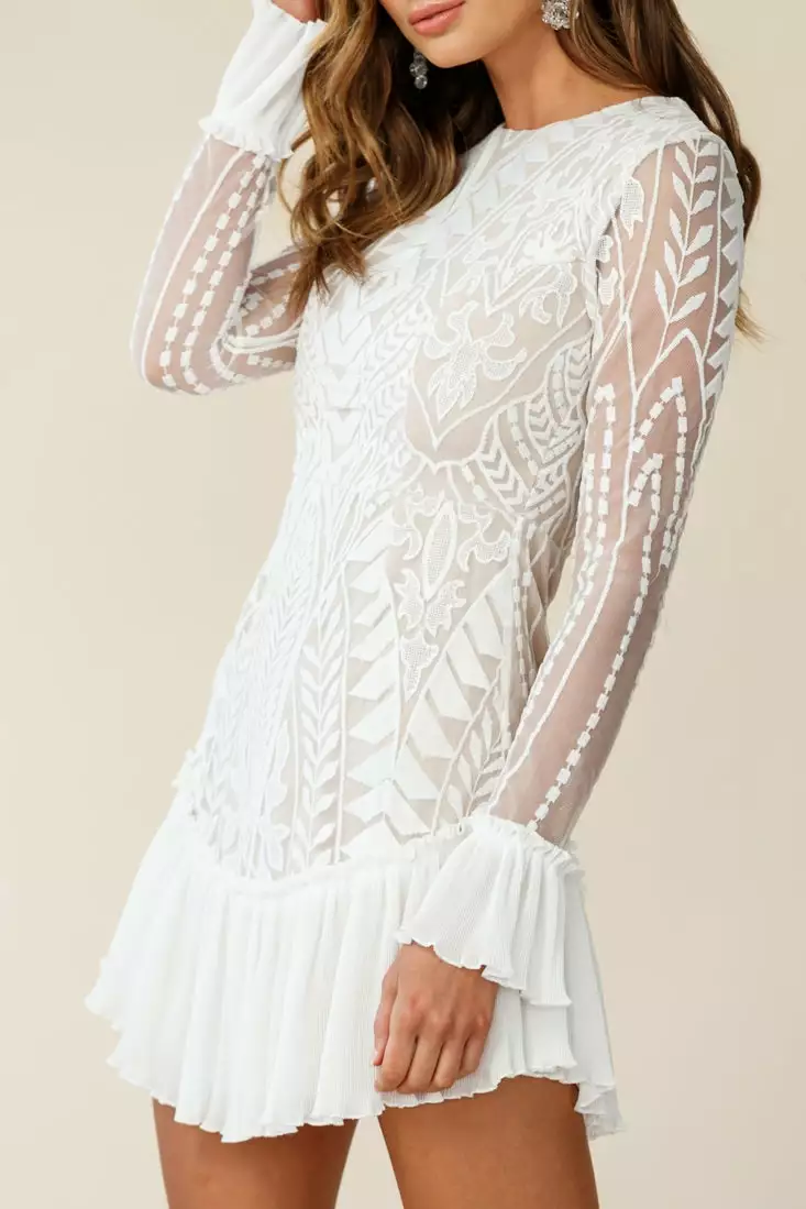 Stop whatever you are doing and take a moment to behold the beauty that is our bestselling Dreamy dress; now in a long sleeve style! Partially lined, it features long sleeves with ruffle cuffs, gorgeous embroidered-mesh overlay, and a flirty ruffle hemline. This dress has it all! Pair it with simple nude heels because this dress is already perfection.