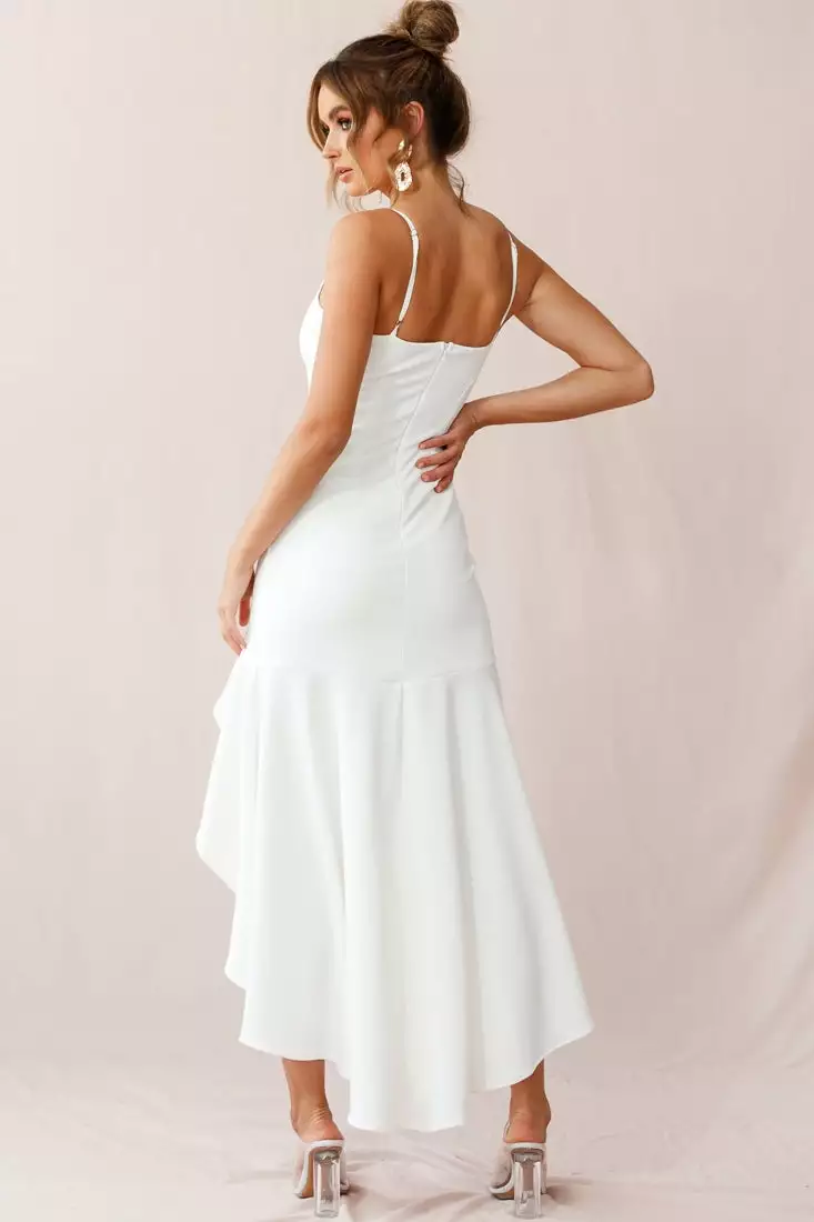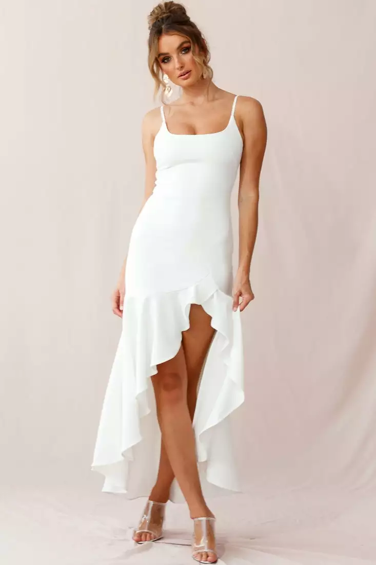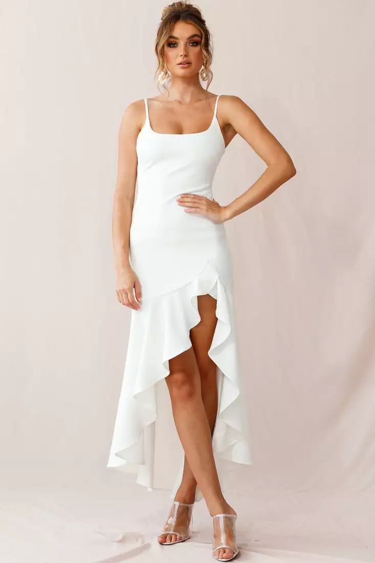 Feel like a dancing queen in one of our best selling styles, the simple but sexy, Emoji dress! We’re obsessed with it’s figure-hugging silhouette and soft fabric with just the right amount of stretch that falls perfectly and looks amazing as you sashay your way across the dance floor. The neckline is so flattering on any bust size and the wide, ruffle drape hem and thigh-high split is the ultimate head turner! Also featuring an invisible zipper fastening at the back and adjustable straps, this dress is a must have! Wear it with strappy, statement heels and dance the night away!