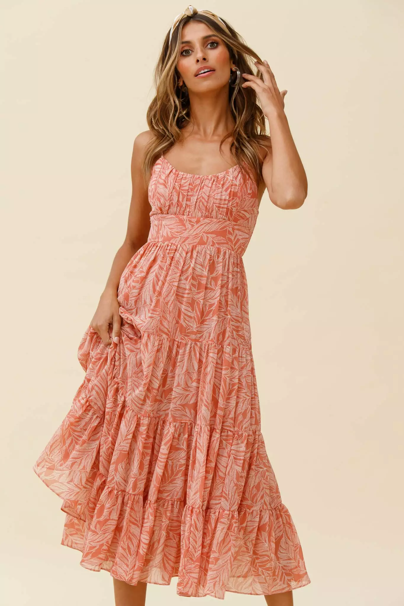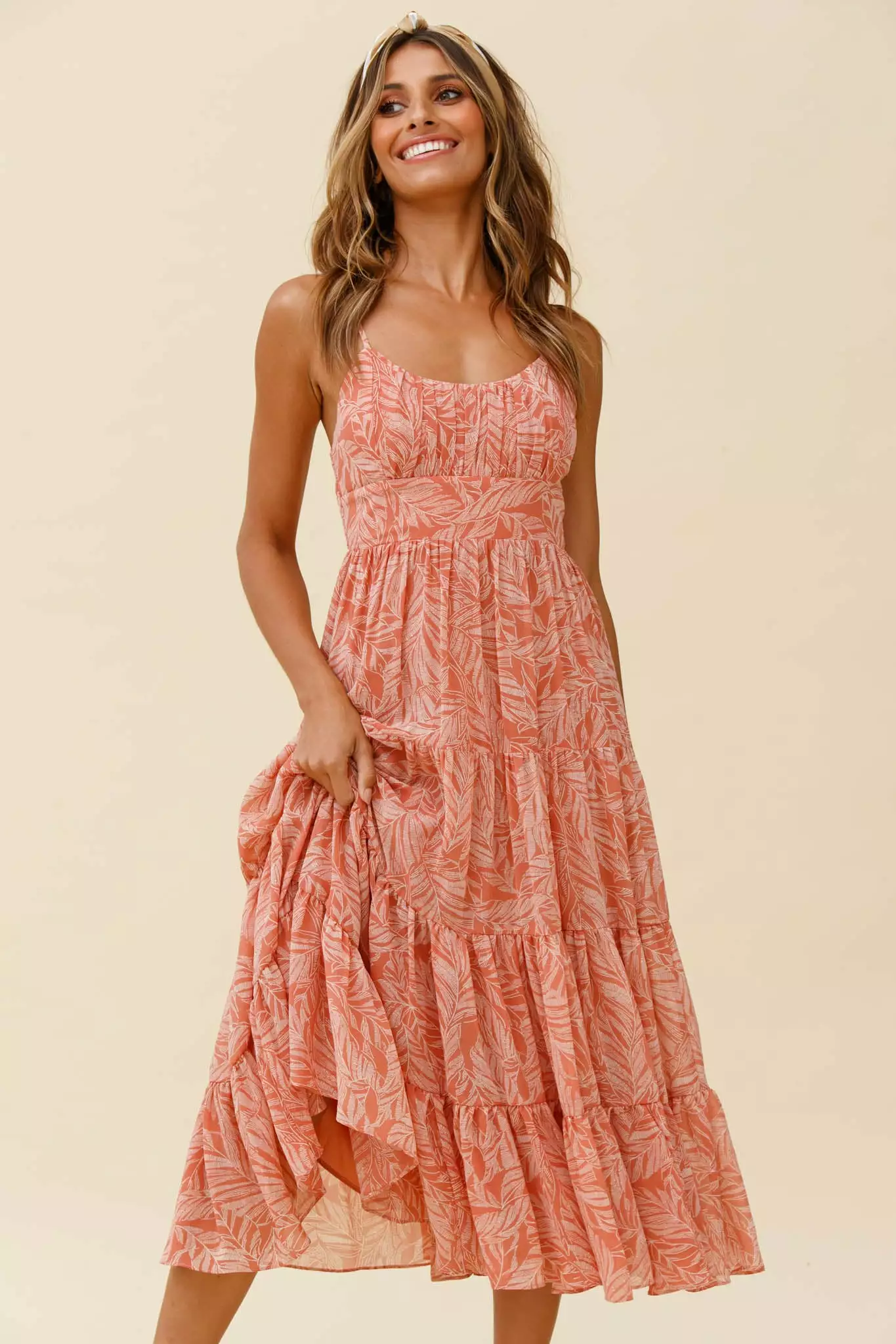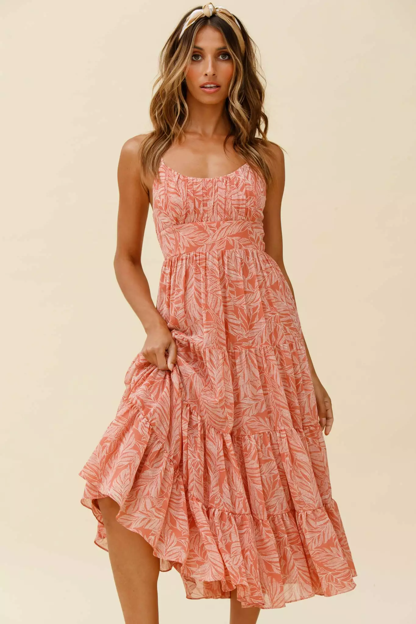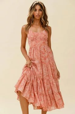 Selfie Leslie Eternal Sunshine Gathered Bust Maxi Dress Leaf Print Pink