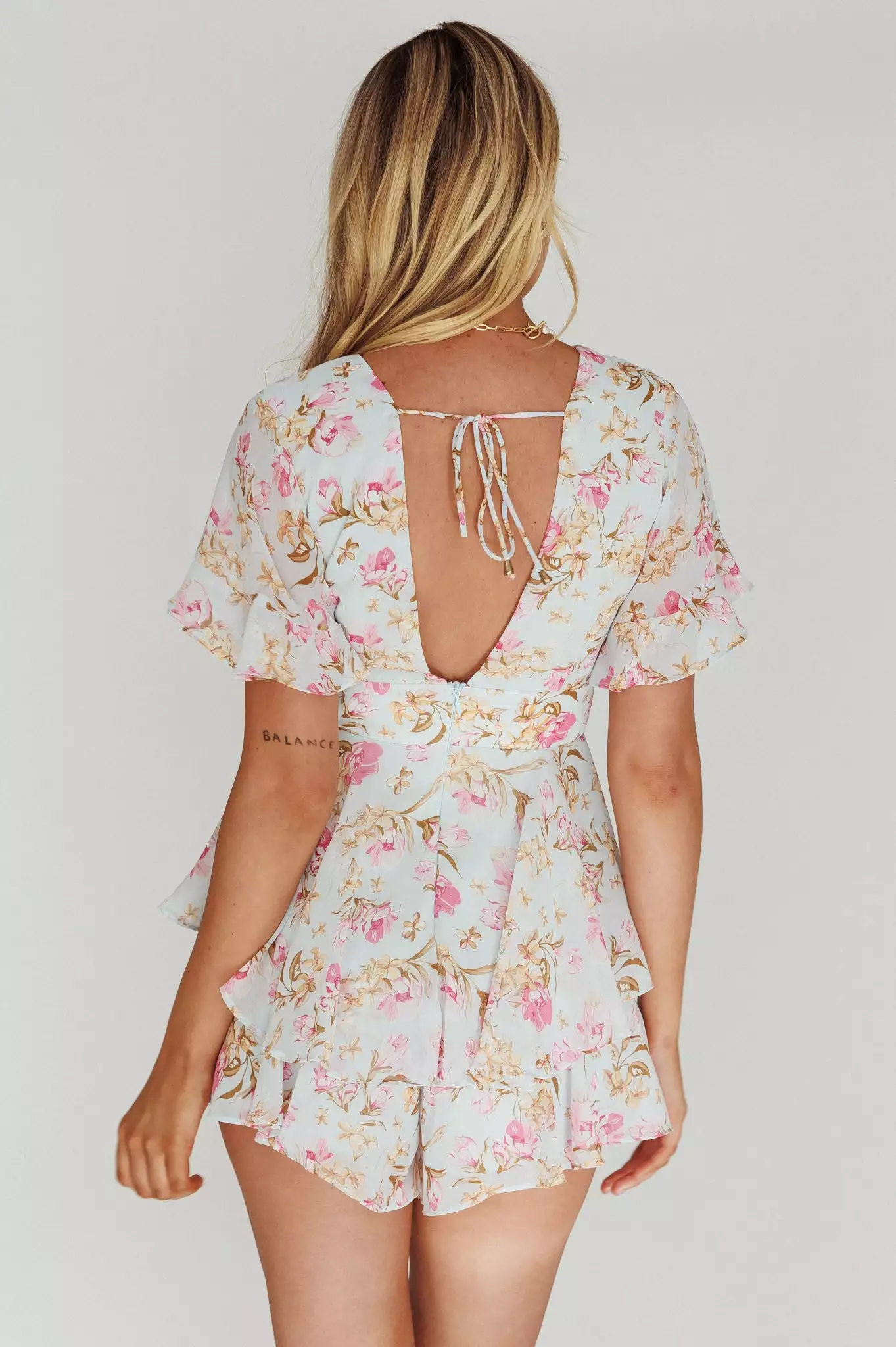 Selfie Leslie Golden Light Pintuck Pleat Romper Floral Blue