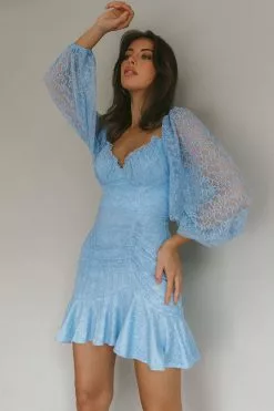 Selfie Leslie Halley Balloon Sleeve Frill Bust Flounce Hem Lace Dress Baby Blue