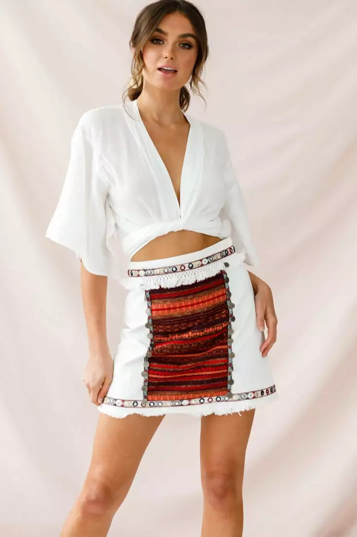Looking good, girl! Our Inca mini skirt features a beautiful embroidered panel on the front, outlined with a super cute bead and coin trim, frayed hem and back zipper closure. Pair it with a simple black tank top and black single strap heels for a super chic look or wear it with our Rivera top cause they are MFEO and so hot together!